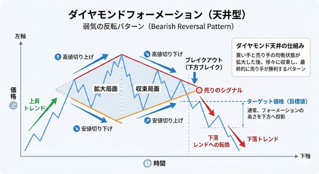 ダイヤモンドフォーメーションは、チャート上の値動きを結んだ線がひし形(ダイヤモンド型)に見える比較的珍しいパターンで、相場の転換点で出やすいシグナルとして機能します。