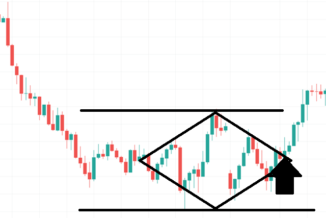 底型の場合、上昇の合図はダイヤモンドの右上にあるレジスタンスライン(上値抵抗線)を価格が明確に上抜けたブレイクアウトの瞬間です。