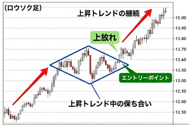 この場合は、ダイヤモンドの上辺(レジスタンスライン)を明確にブレイクすることで、元の上昇トレンドが再開したと判断されます。