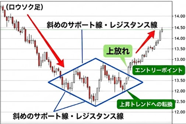 - ひし形を上下どちらかに明確に抜けた瞬間(ブレイクアウト)に、新しいトレンドが発生しやすい