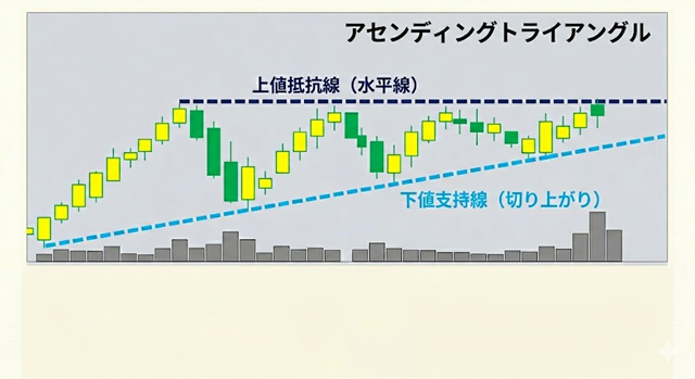パターンの後半部分が、上値の抵抗線が水平で下値が切り上がっていく「アセンディングトライアングル」に似た形になりやすいのが特徴です。
