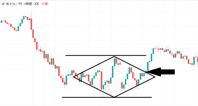 ひし形を上下どちらかに明確に抜けた瞬間(ブレイクアウト)に、新しいトレンドが発生しやすいという特徴があります。