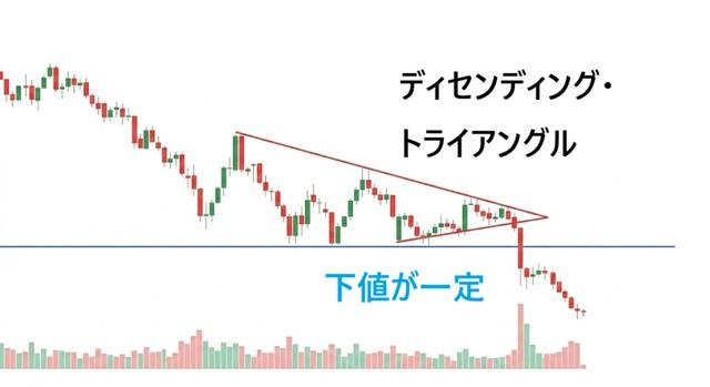 パターンの後半が、下値の支持線が水平で上値が切り下がっていく「ディセンディングトライアングル」のような形になります。