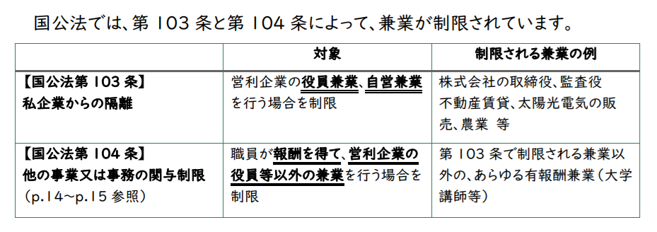 国家公務員は、国家公務員法第103条と第104条により「役員兼業」「自営兼業」などが制限されています。