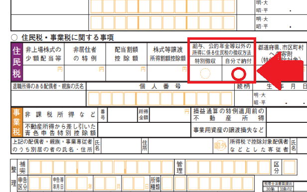確定申告または住民税申告の申告書類にある「住民税の納税方法」の欄で、