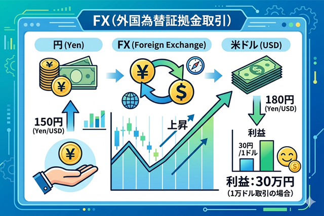 FX(Foreign Exchange)は「外国為替証拠金取引」と言い、異なる通貨を売買し買値と売値の差額で利益を狙う投資です。