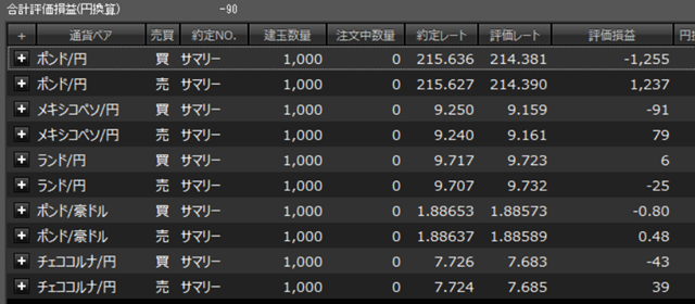 ポンド円はポジションの金額(買215,636円、売215,627円)が多いこともあり、評価損益は±1,200円以上です。