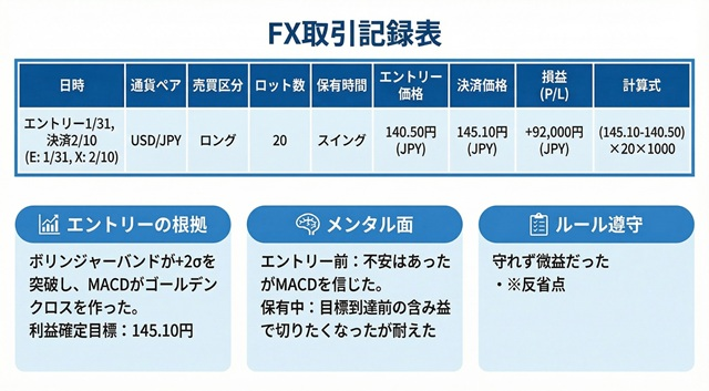 トレードを記録し、「勝ちパターン」と「負けパターン」を体感ではなく数値やデータで把握・再現することでFXがギャンブルではなく「投資」に変わっていきます。