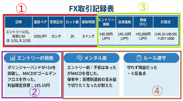 再現性を高めるために、大きく分けて「基本データ」「エントリーの根拠」「結果」「振り返り」の4つのパートを書きましょう。