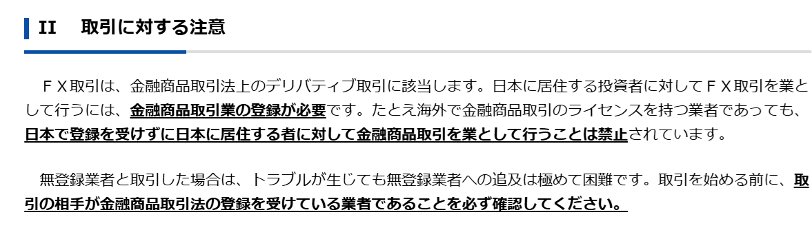 金融庁のホームページには「たとえ海外で金融商品取引のライセンスを持つ業者であっても、日本で登録を受けずに日本に居住する者に対して金融商品取引を業として行うことは禁止されています」という警告が書かれています。
