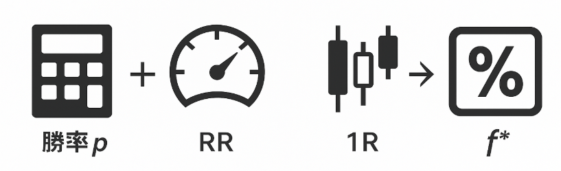 ケリー基準は、勝率pとリスクリワード(RR)から1回の許容リスク%を決め、感覚のブレを抑える資金管理の土台です。