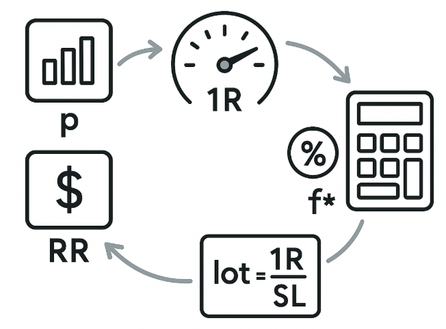 ここでは、ケリー基準をR(リスク倍率)でシンプルに計算し、実際のロットへ落とし込む流れを示します。
