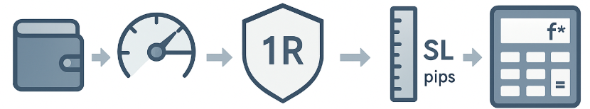 1R(許容損失額)が決まったら、ロット=1R ÷(SL pips × pips価値)で求めます。