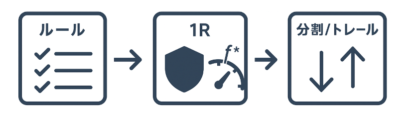 ポイントは、分割しても合計リスクは常にケリー由来の1Rに収めること。ここが崩れると、理論の効果が薄れてしまうので、注意が必要です。