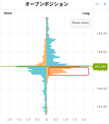 その状態において、含み損を抱えるトレーダーがどの程度存在するのかは、オープンポジションに表示される横棒の大きさから推察可能です。
