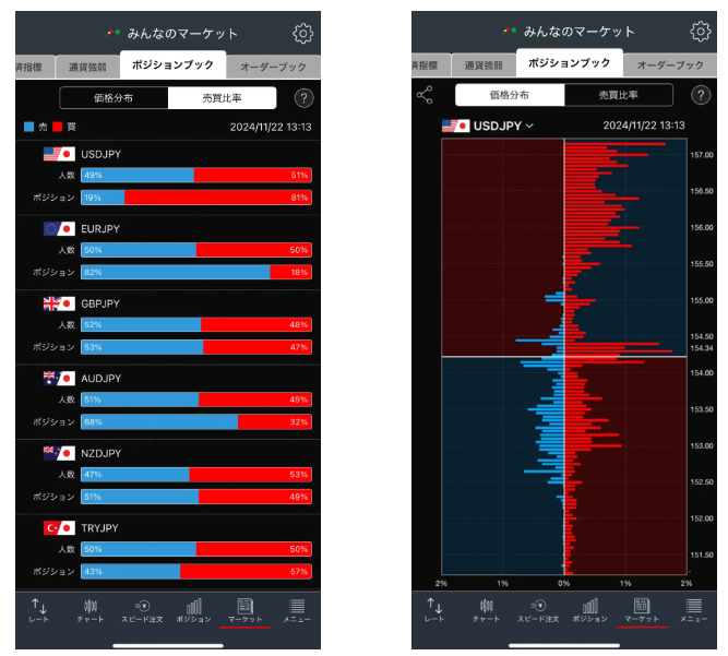 機能:ポジションブック(人数・数量ごとの偏り)、オーダーブック、売買比率