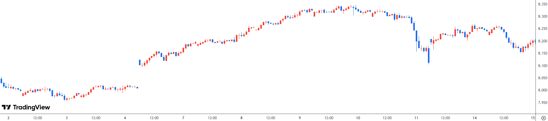 月初から10日までは、政策継続観測と金利差の意識がキャリー志向を後押しし、8.00台前半から8.33〜8.35近辺まで素直に上昇しています。