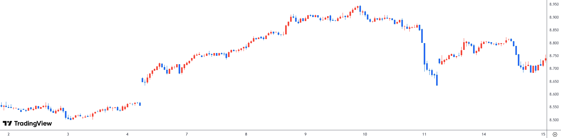 - 円主導で8.45→8.90台手前まで上伸、11日に8.66–8.70へ巻き戻し → 週末8.80前後へ持ち直し。