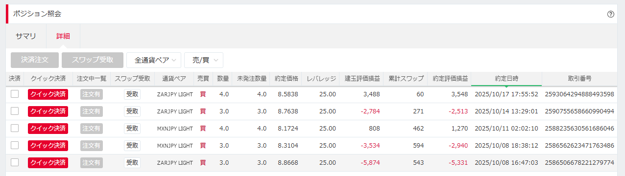 日々のスワップを着実に受け取りつつ、レバ5倍以下の資金管理を堅持しています。