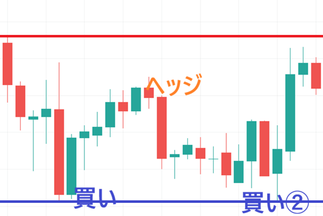 予想通りに下がれば、売りを残したまま買い②を追加します。