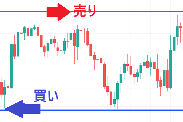 上限と下限の間を行き来する、いわゆる「横ばい」の状態ですので下限で買い上限で売ることで利益が得られます。